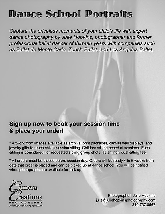 Announcing our full commitment to dance school portrait photography sessions as Julie Hopkins Photography, a division of Camera Creations LLC. Below is our new flyer that is sent to dance schools in order to announce the upcoming portrait session at the dance school. We provide this email flyer, a poster, sign-up sheets, artwork price menu, artwork order forms for the school before the session day. All orders are placed before the session, and when we arrive at the school for the photography shoot we come with our professional lighting equipment, backdrop, assistant to pose the dancers and lots of enthusiasm for what we love to do.